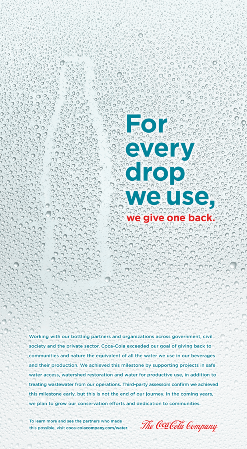 Back in 2007, Coca-Cola promised that for every drop of water they take, they’d give one back. The announcement came following some horrendous press in the mid aughts regarding Coca-Cola’s penchant for siphoning water from local sources in order to keep costs low. Initially set for 2020, the company announced that they had reached their water replenishment goal in 2016 – even taking out a full page ad in the New York Times to celebrate this unbelievable feat. The problem was and is that this feat isn’t just unbelievable – it is in fact not true. Coke’s ambitious aim was wrapped in all the fixins of a greenwashing campaign extravaganza.