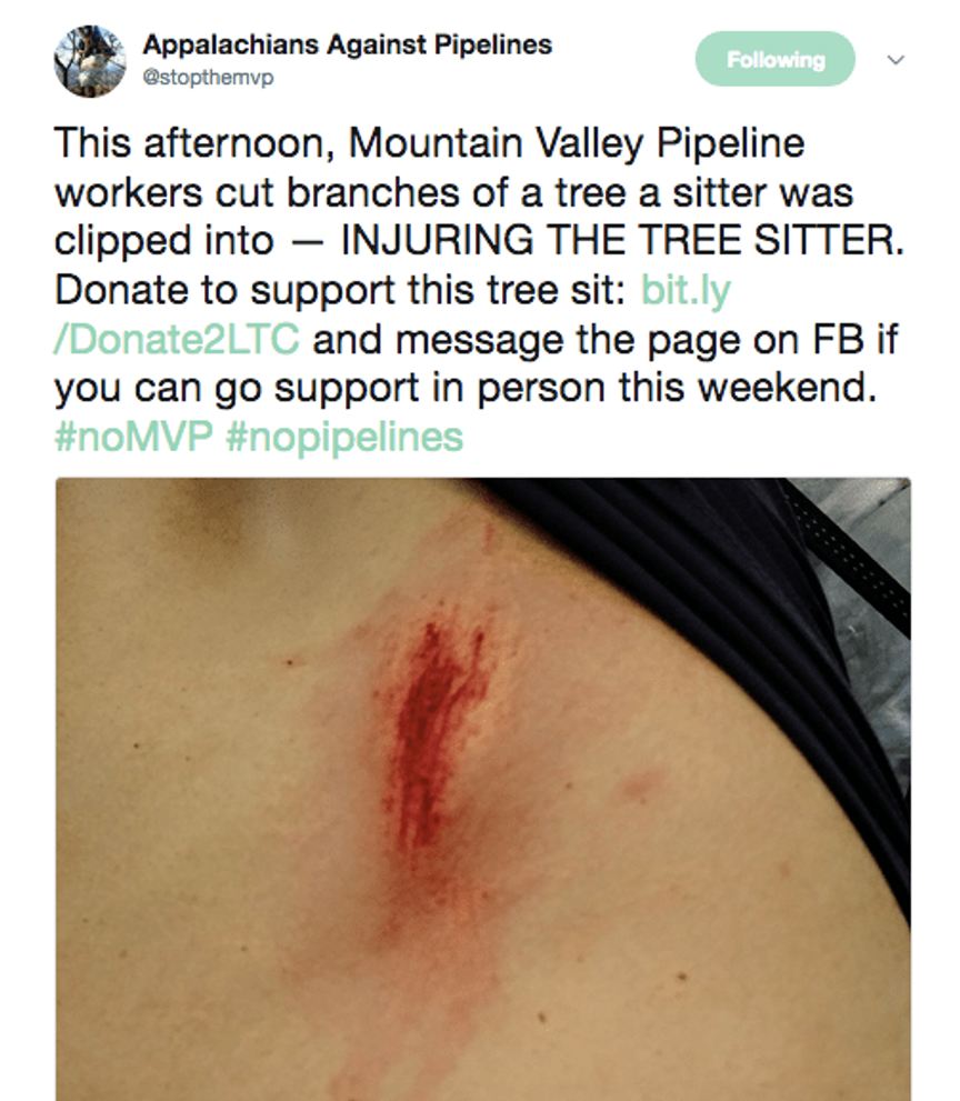 The people who exposed the turkey death camps is just one such example. A few weeks ago, four folks down in Louisiana were arrested by police for, get this, documenting the continued construction of the Bayou Bridge Pipeline during a court-ordered work stoppage. The cops, however, opted to arrest the water protectors rather than the construction workers illegally tearing up land for a fucking oil pipeline. That mentality was also at play on May 23rd along the proposed route of the Mountain Valley Pipeline. A protector occupying a monopod finally came down after four days without food. The forest service had set up a blockade and wasn’t allowing any supplies up to the monopod – which is basically torture. And you read that correctly: the Forest Service. The agency whose motto is “caring for the land and serving people.” That is their god damn motto! And yet they not only wouldn’t allow ground support to serve people the essentials of survival, they’re offering up that land they care so much about to be raped and destroyed by a natural gas pipeline. Considering their unique brand of caring and serving, it’s no surprise that they also stood by when two days later, on May 25th, workers cut the branches of a tree that housed a tree-sitter, injuring that person. Anybody caring or serving on that one? Anyone there to serve or protect?