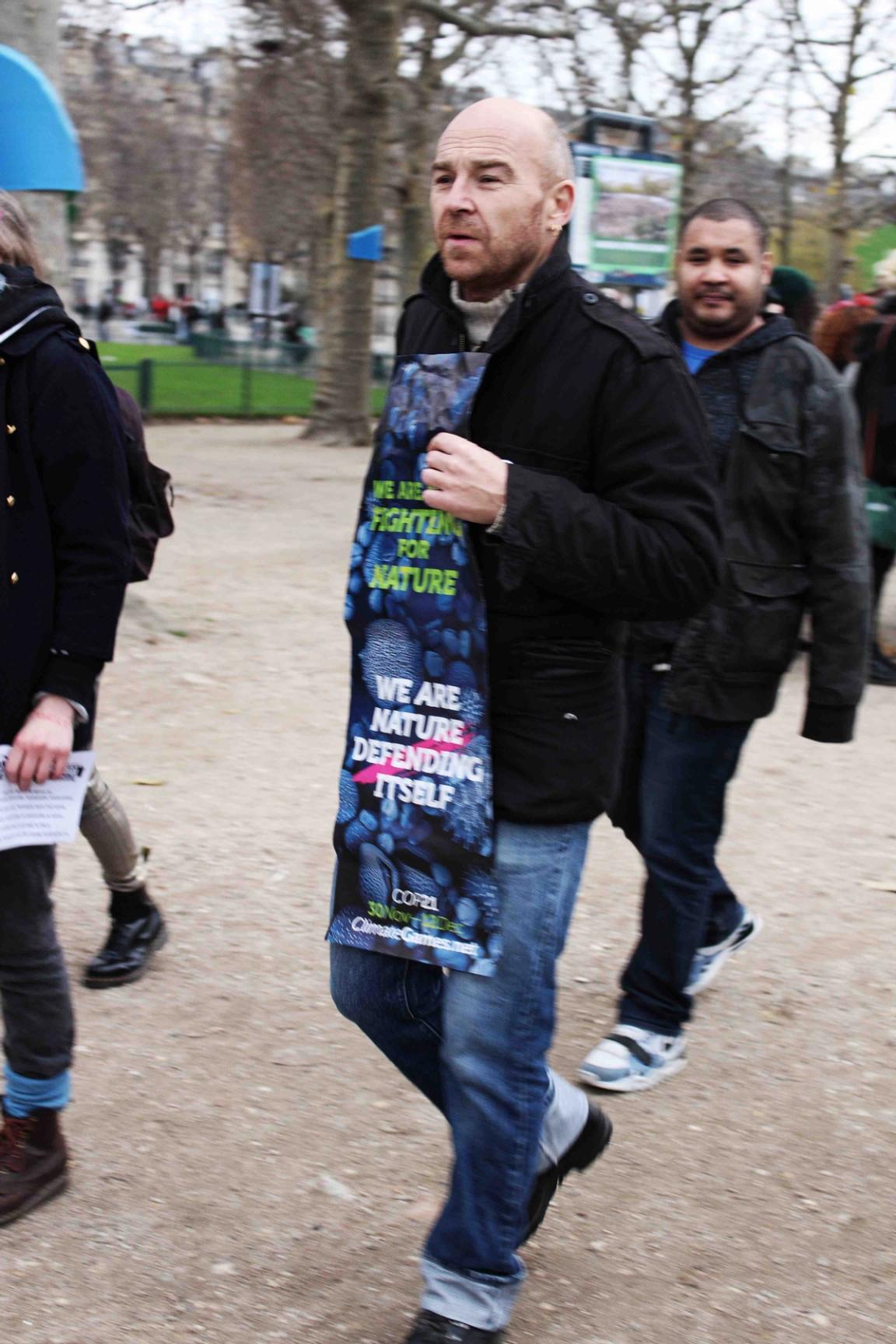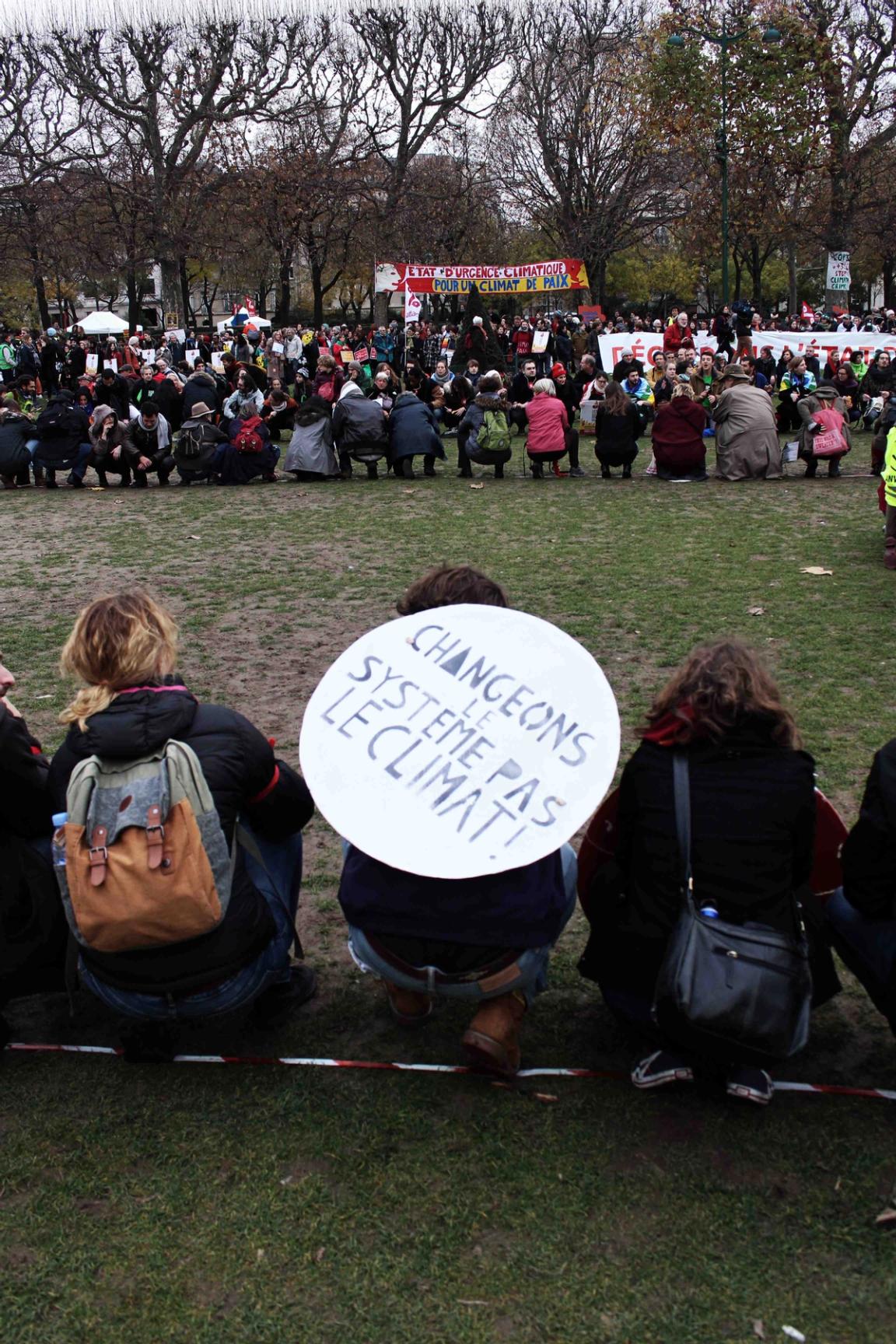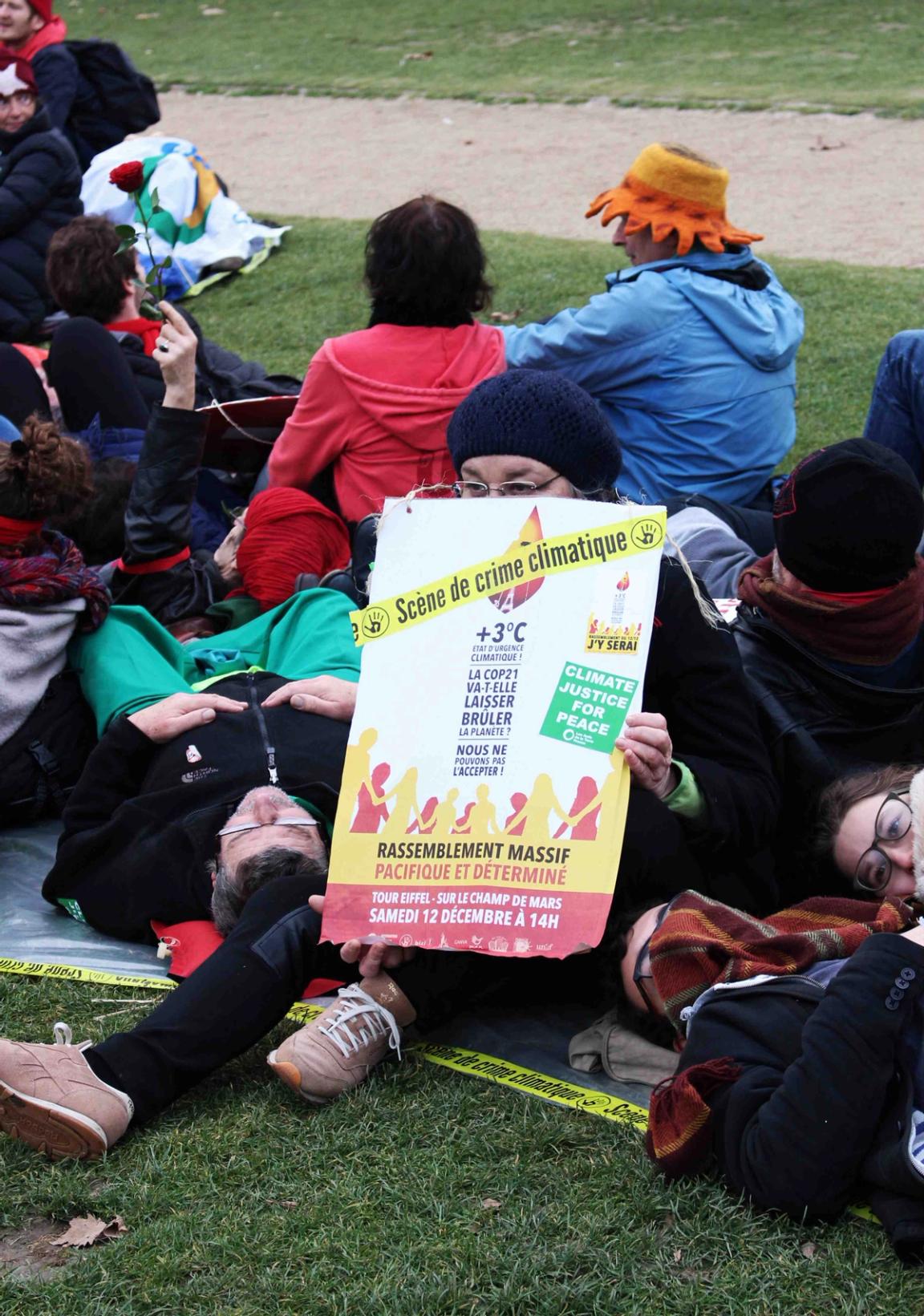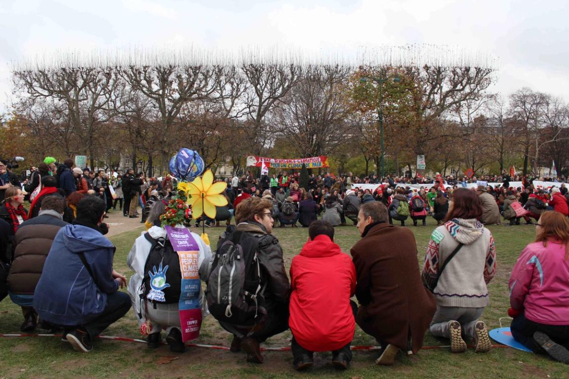 In the afternoon of D12, the final action – organized by a coalition of groups – featured a human chain around Champs de Mars, the open rectangular field directly beneath the Eiffel Tower. Organizers also grouped protestors onto pre-laid markers to spell out +3 degrees, the rise in global temperatures that we’re facing due to governmental inaction.