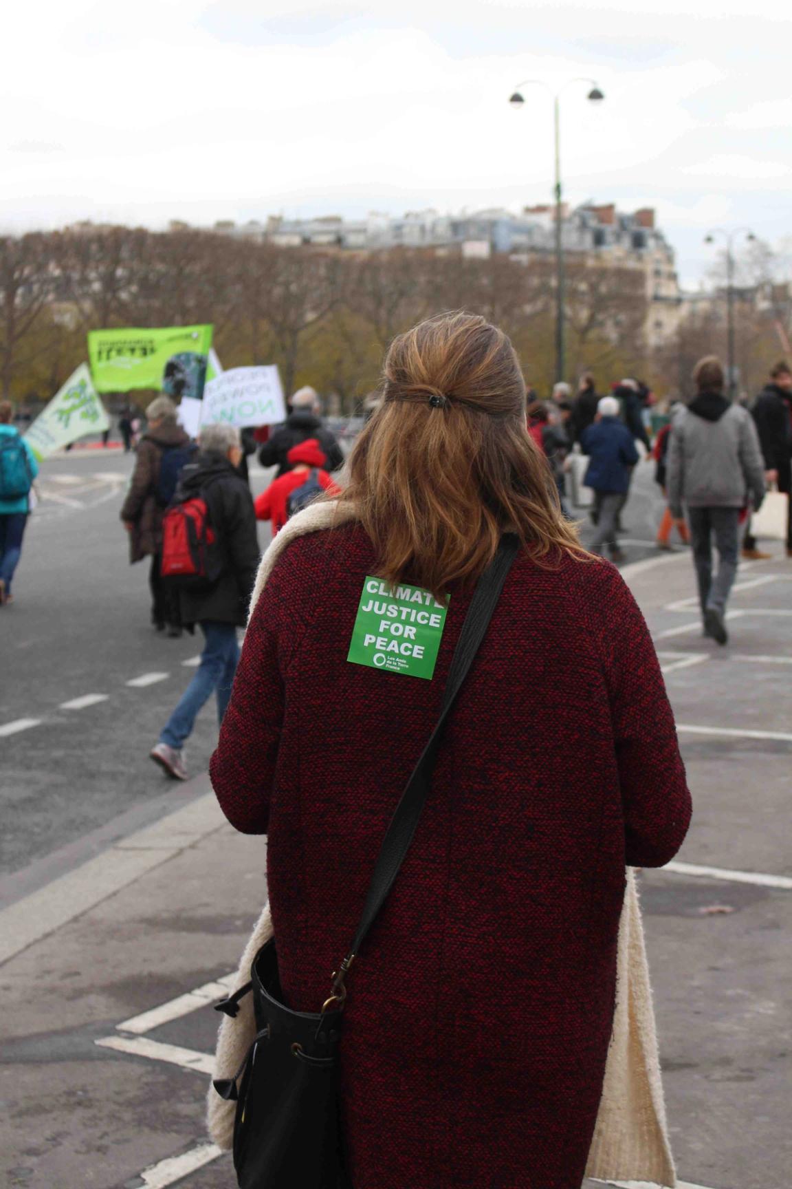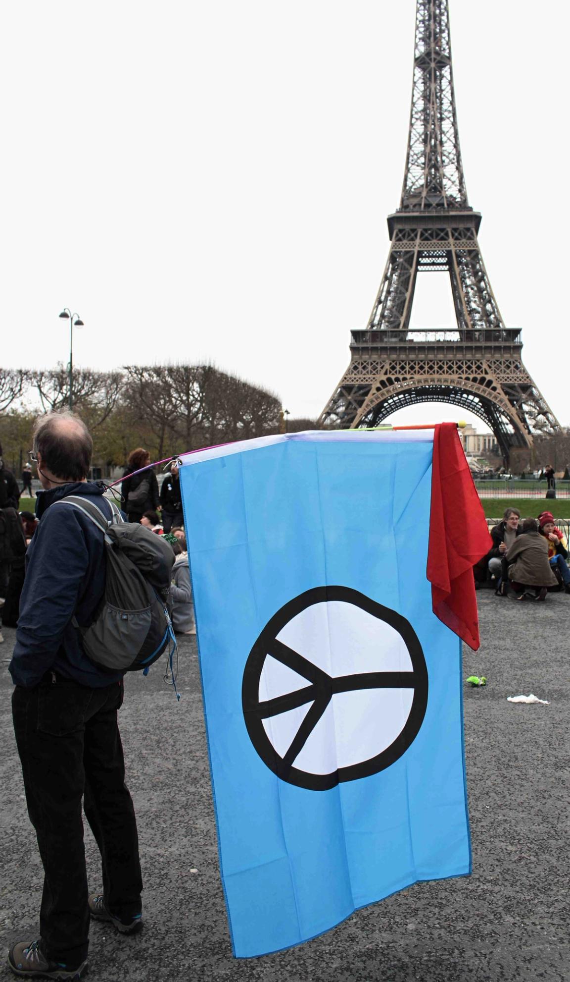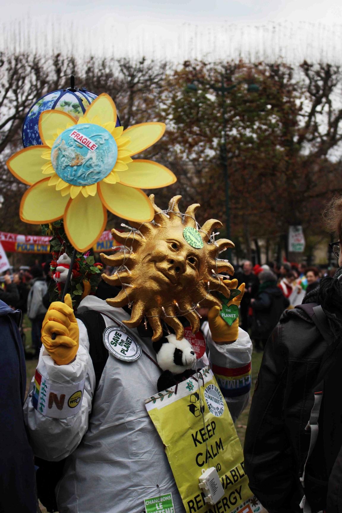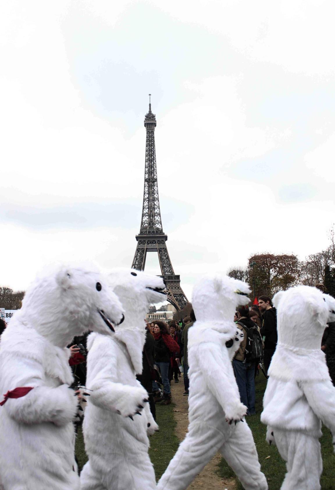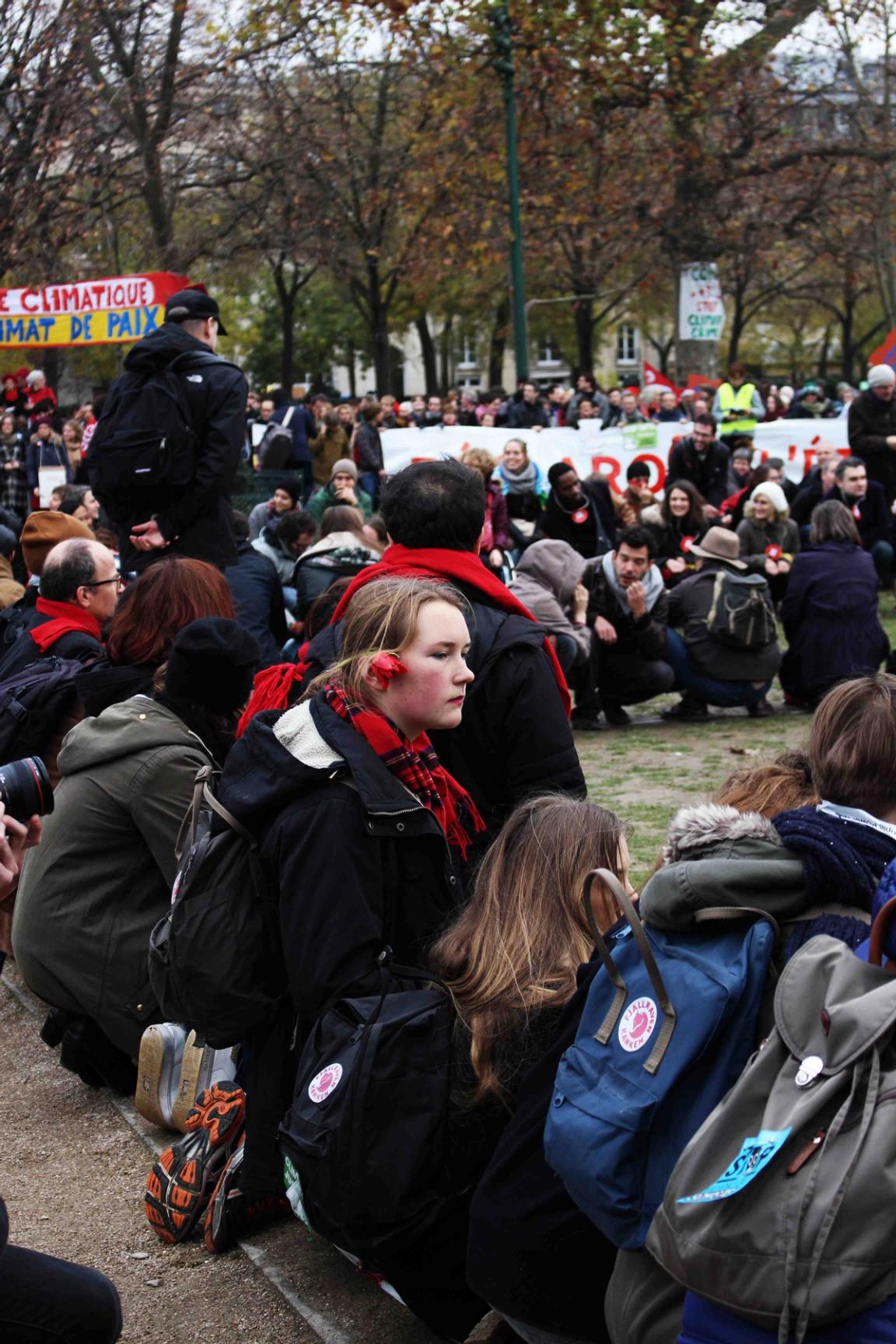 In the afternoon of D12, the final action – organized by a coalition of groups – featured a human chain around Champs de Mars, the open rectangular field directly beneath the Eiffel Tower. Organizers also grouped protestors onto pre-laid markers to spell out +3 degrees, the rise in global temperatures that we’re facing due to governmental inaction.