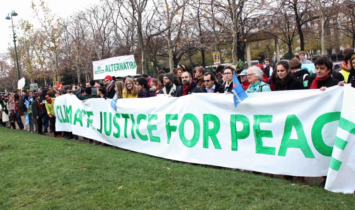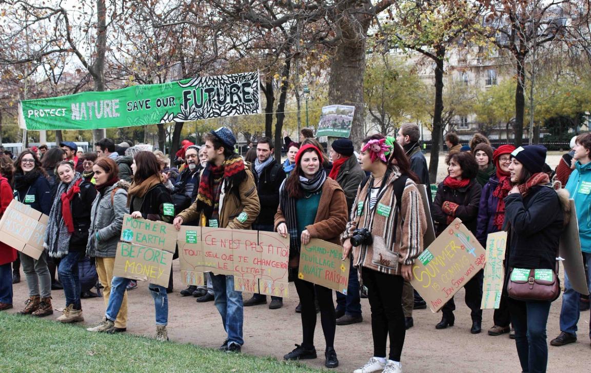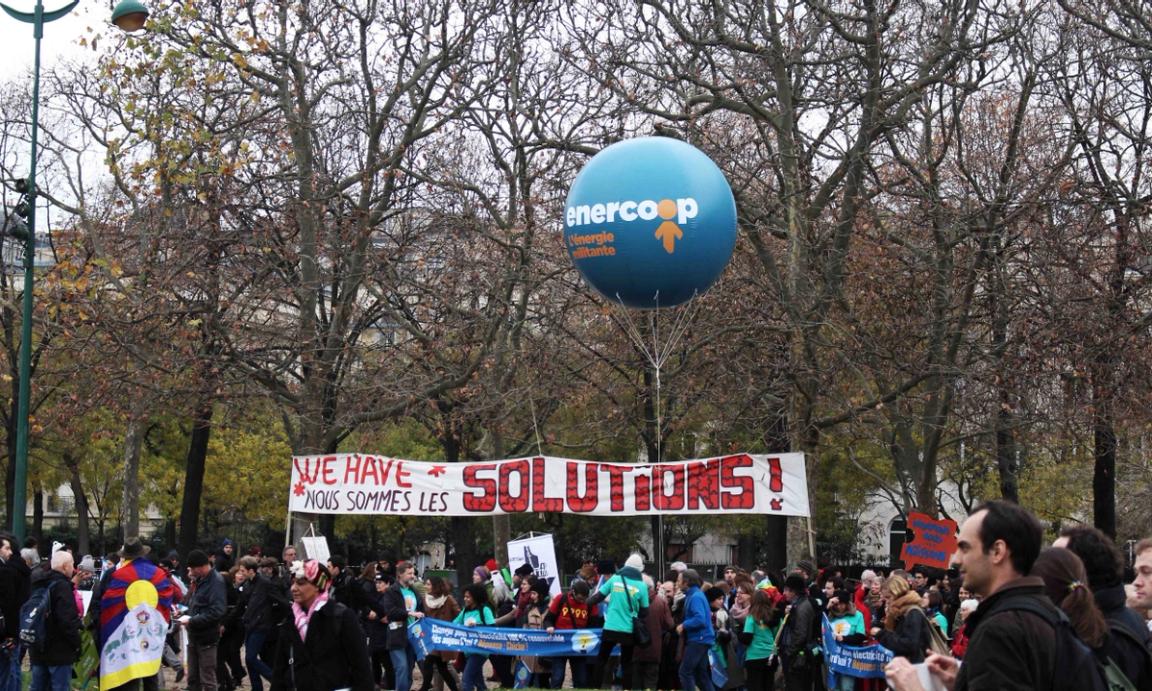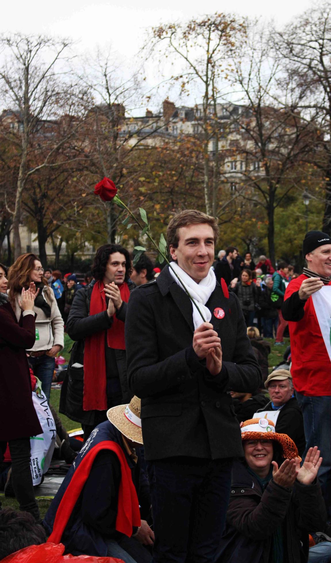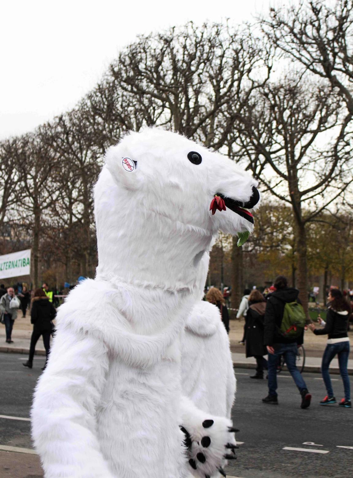 In the afternoon of D12, the final action – organized by a coalition of groups – featured a human chain around Champs de Mars, the open rectangular field directly beneath the Eiffel Tower. Organizers also grouped protestors onto pre-laid markers to spell out +3 degrees, the rise in global temperatures that we’re facing due to governmental inaction.