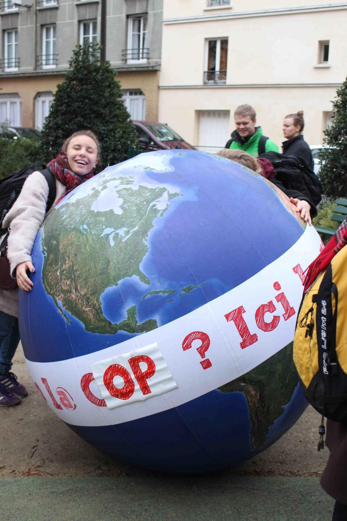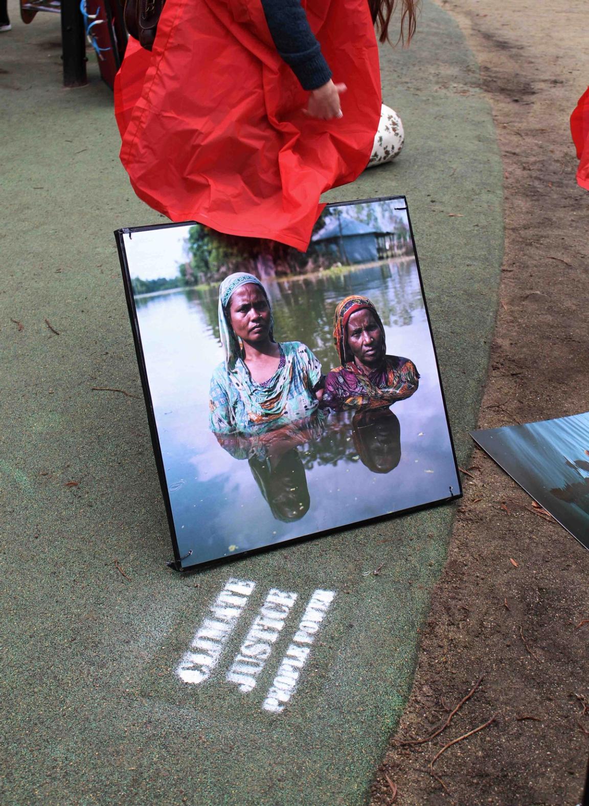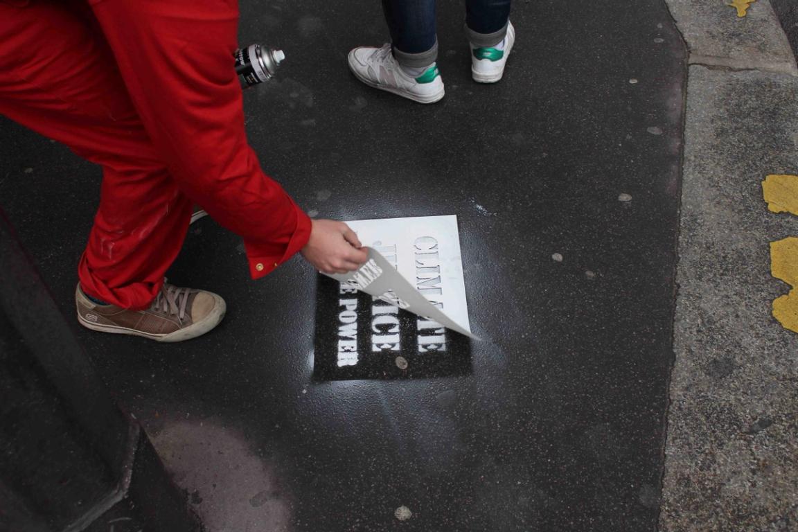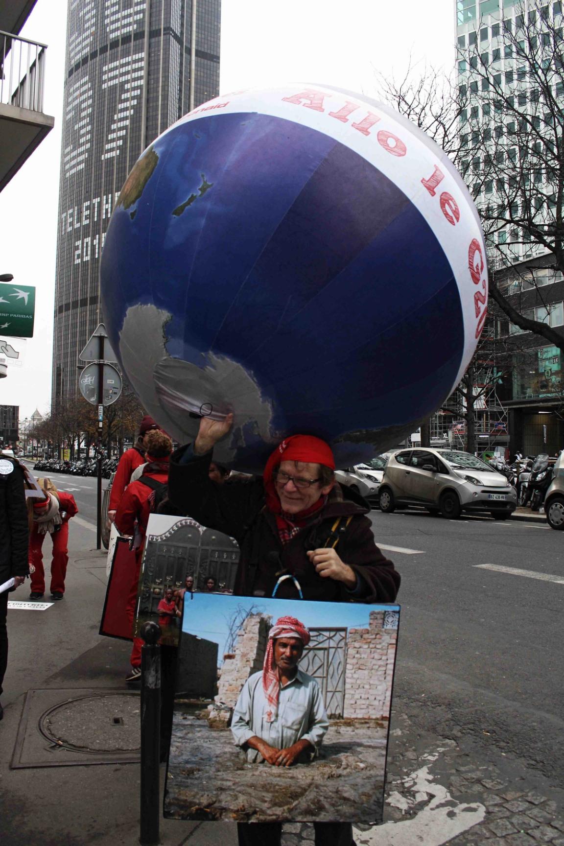 Audrey Arjoune of Peuples Solidaires was the point person of our letter “P” and brought along quite the bevy of action aids to use – including 2 inflatable globes, spray paint and stencils – but most inspiring and brilliant of all, images instead of posters. These images, shot by Gideon Mendel, shows people standing in flooded areas of the world – victims of climate change, given loud voices through this action. People from India to New Orleans, Jakarta to the Mid-West US – these faces and the stories behind them represent not only the urgency of this fight but the power of the people behind it.
