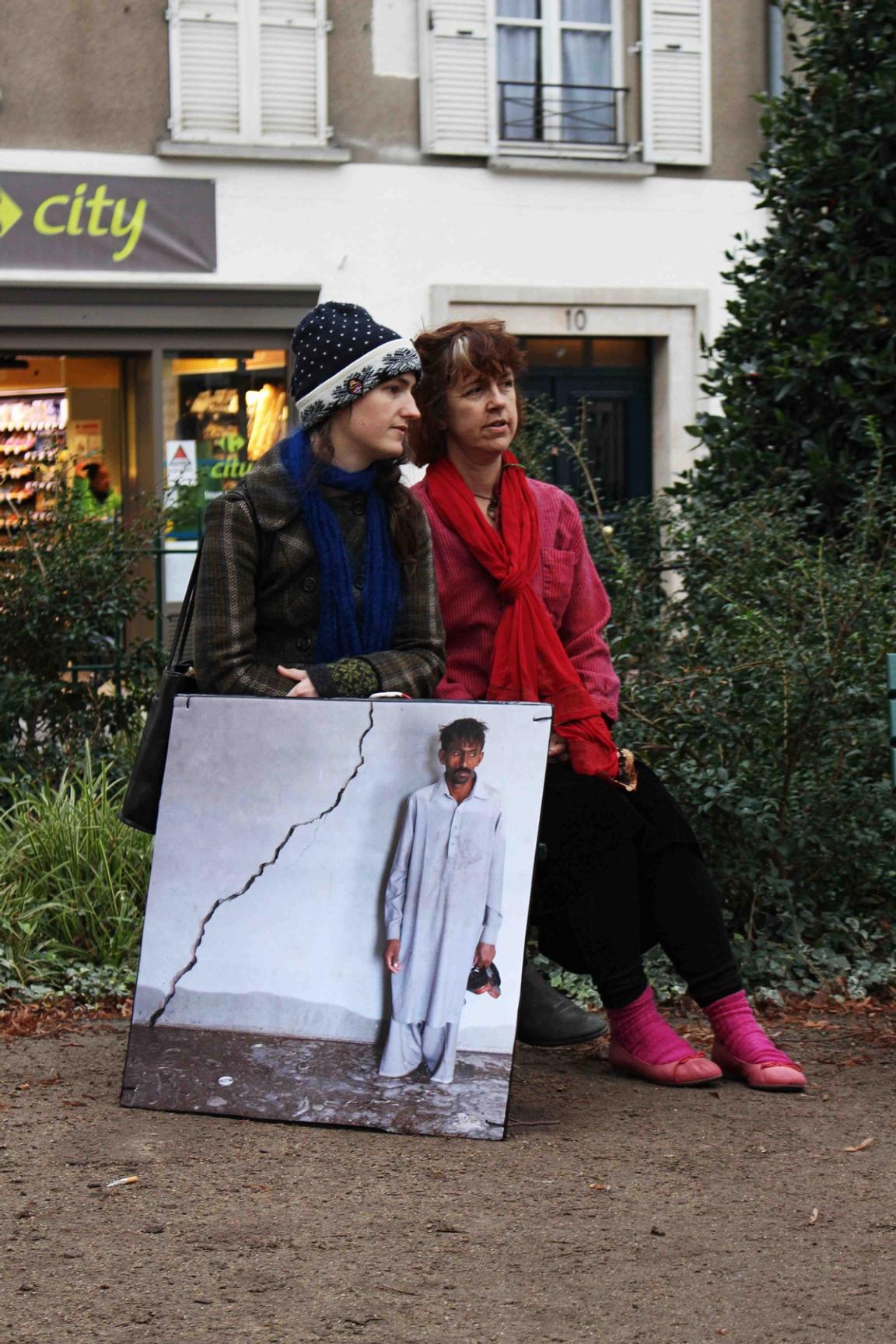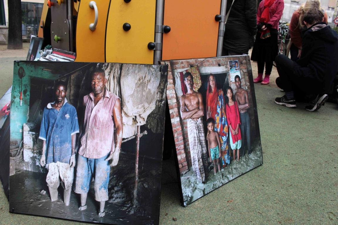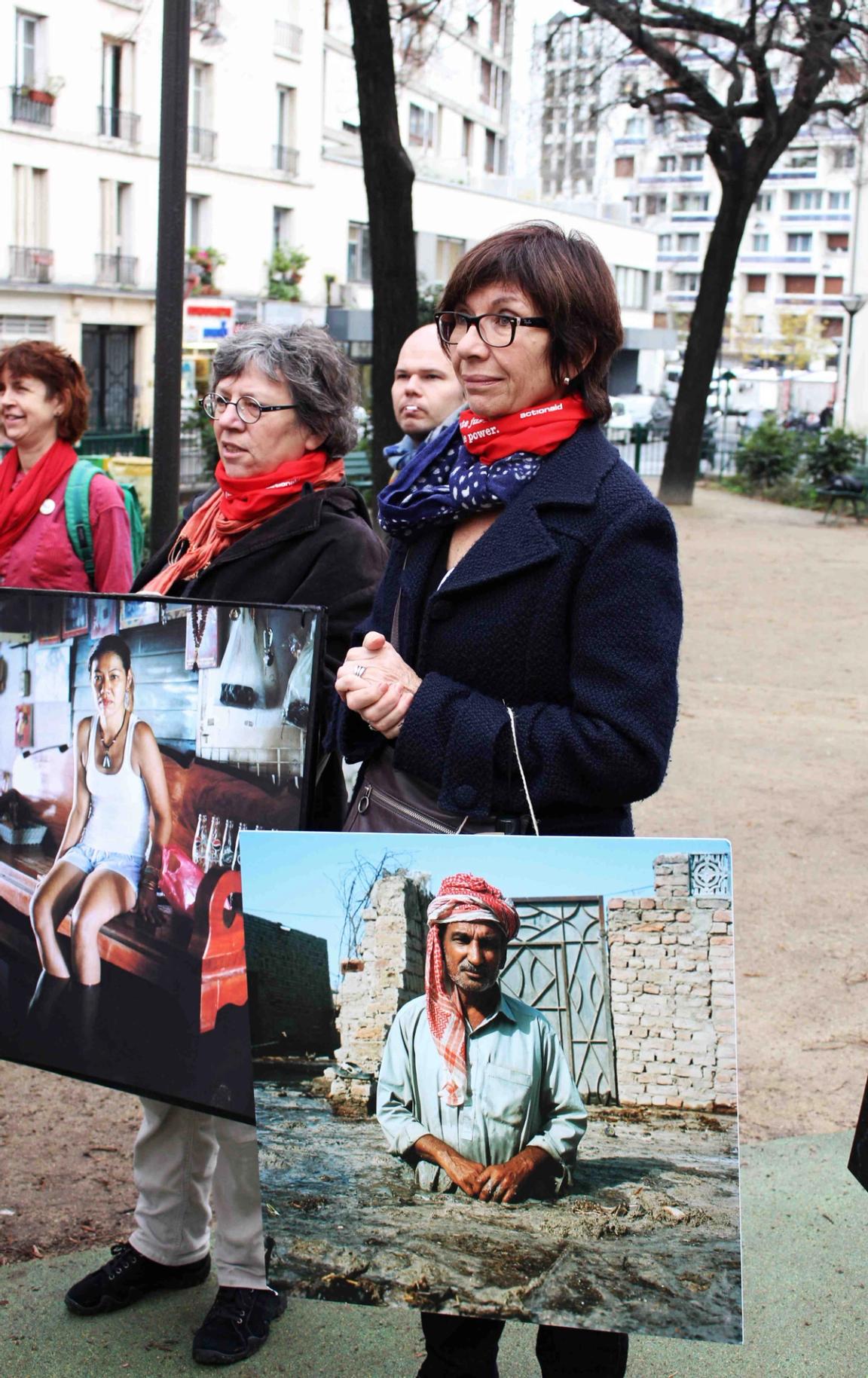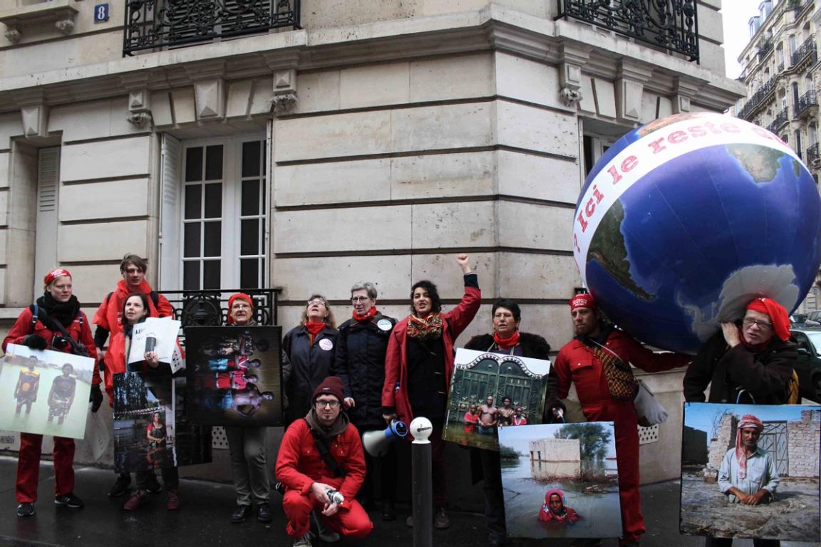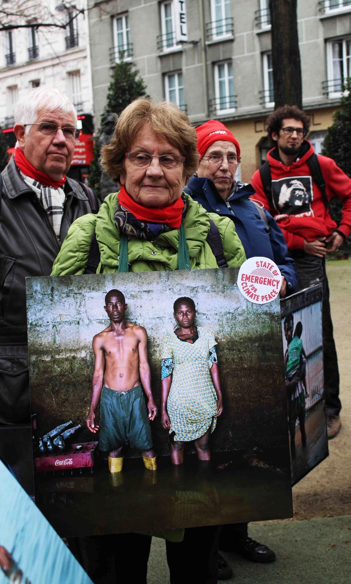 Audrey Arjoune of Peuples Solidaires was the point person of our letter “P” and brought along quite the bevy of action aids to use – including 2 inflatable globes, spray paint and stencils – but most inspiring and brilliant of all, images instead of posters. These images, shot by Gideon Mendel, shows people standing in flooded areas of the world – victims of climate change, given loud voices through this action. People from India to New Orleans, Jakarta to the Mid-West US – these faces and the stories behind them represent not only the urgency of this fight but the power of the people behind it.