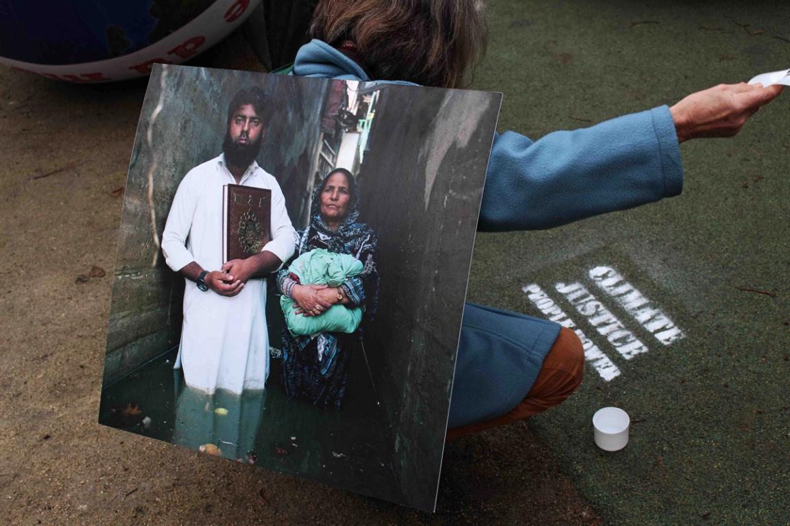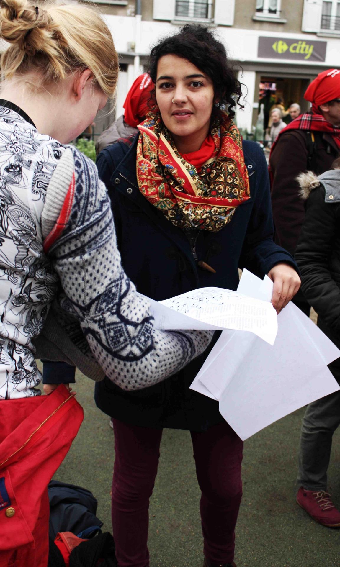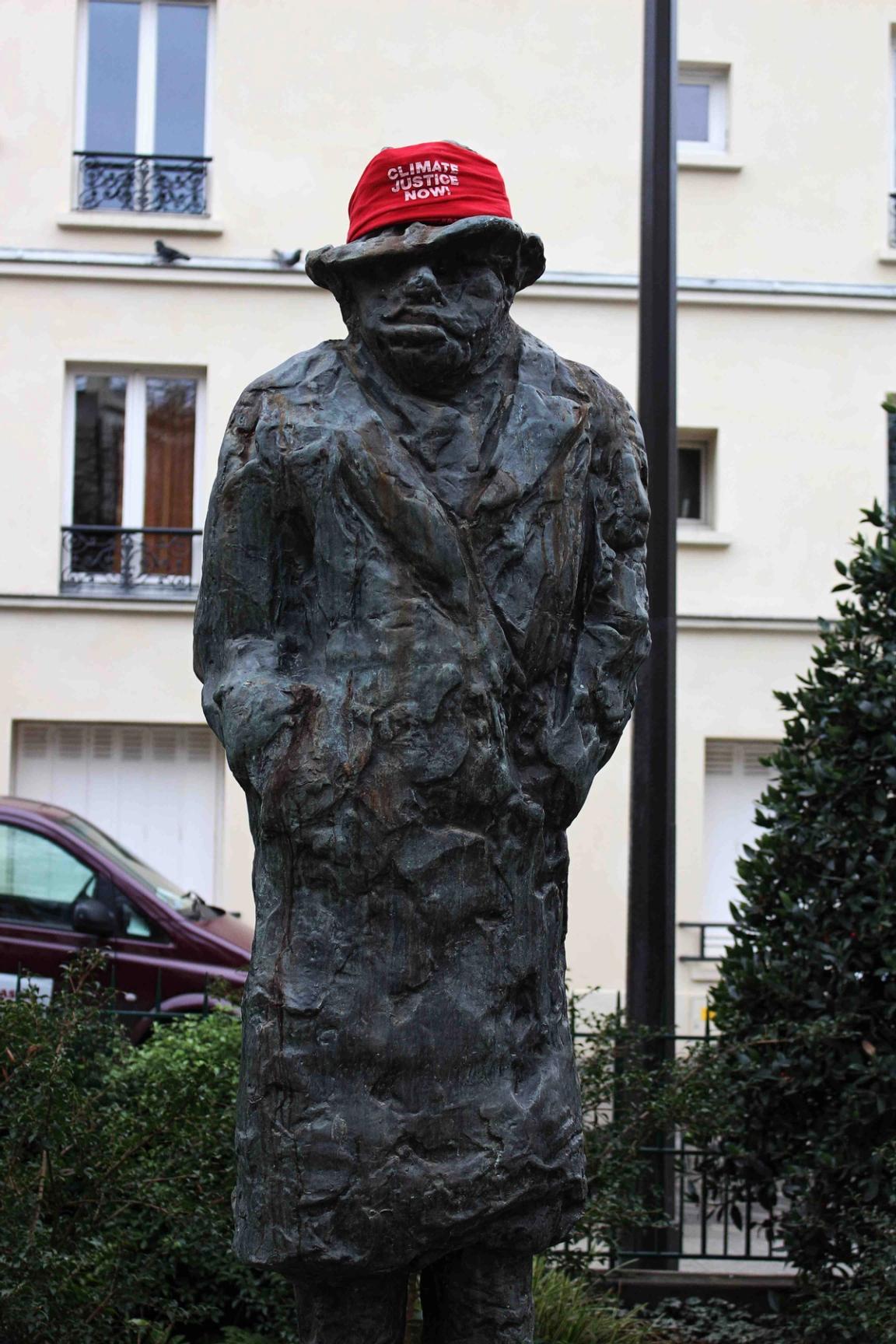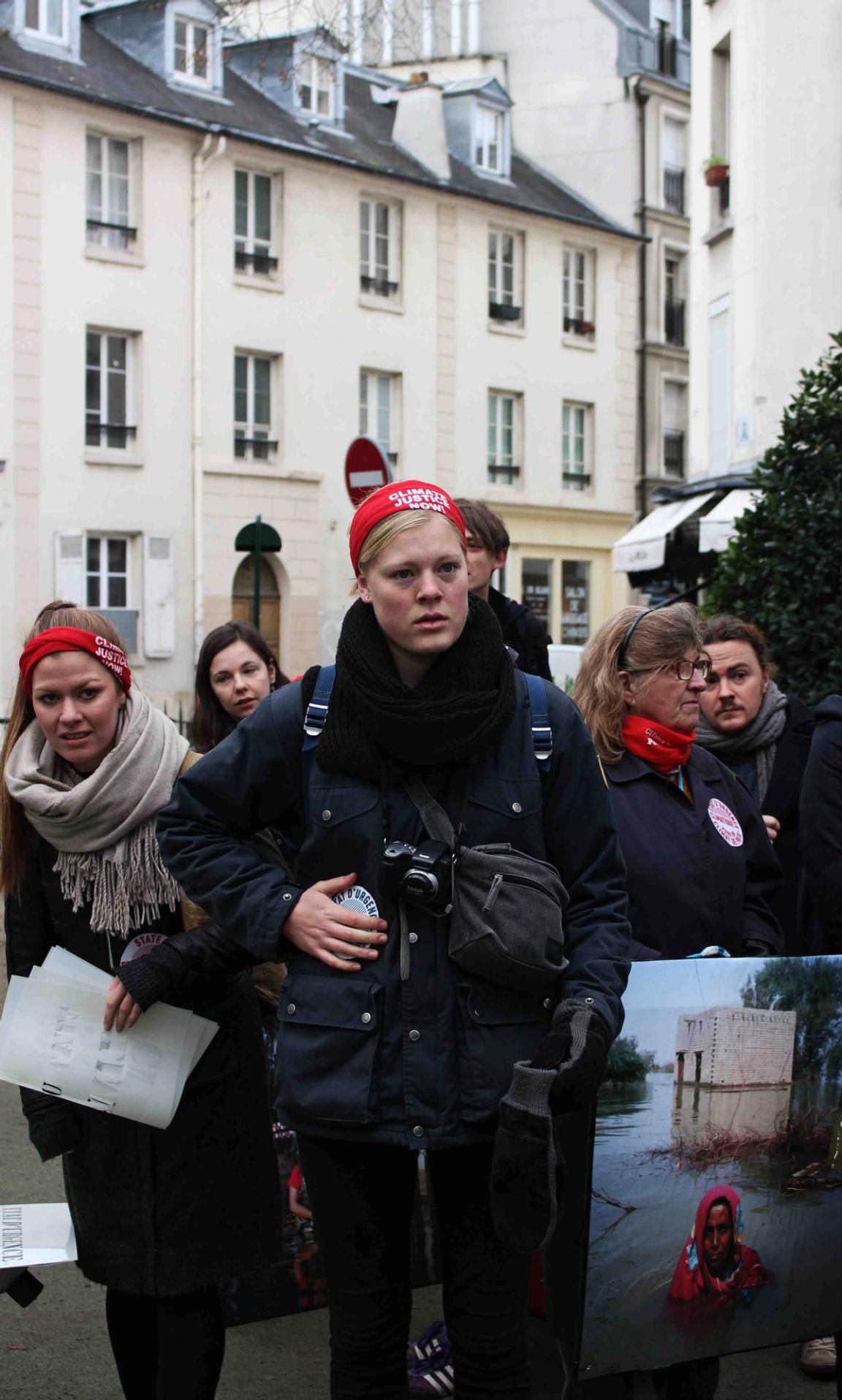 Audrey Arjoune of Peuples Solidaires was the point person of our letter “P” and brought along quite the bevy of action aids to use – including 2 inflatable globes, spray paint and stencils – but most inspiring and brilliant of all, images instead of posters. These images, shot by Gideon Mendel, shows people standing in flooded areas of the world – victims of climate change, given loud voices through this action. People from India to New Orleans, Jakarta to the Mid-West US – these faces and the stories behind them represent not only the urgency of this fight but the power of the people behind it.