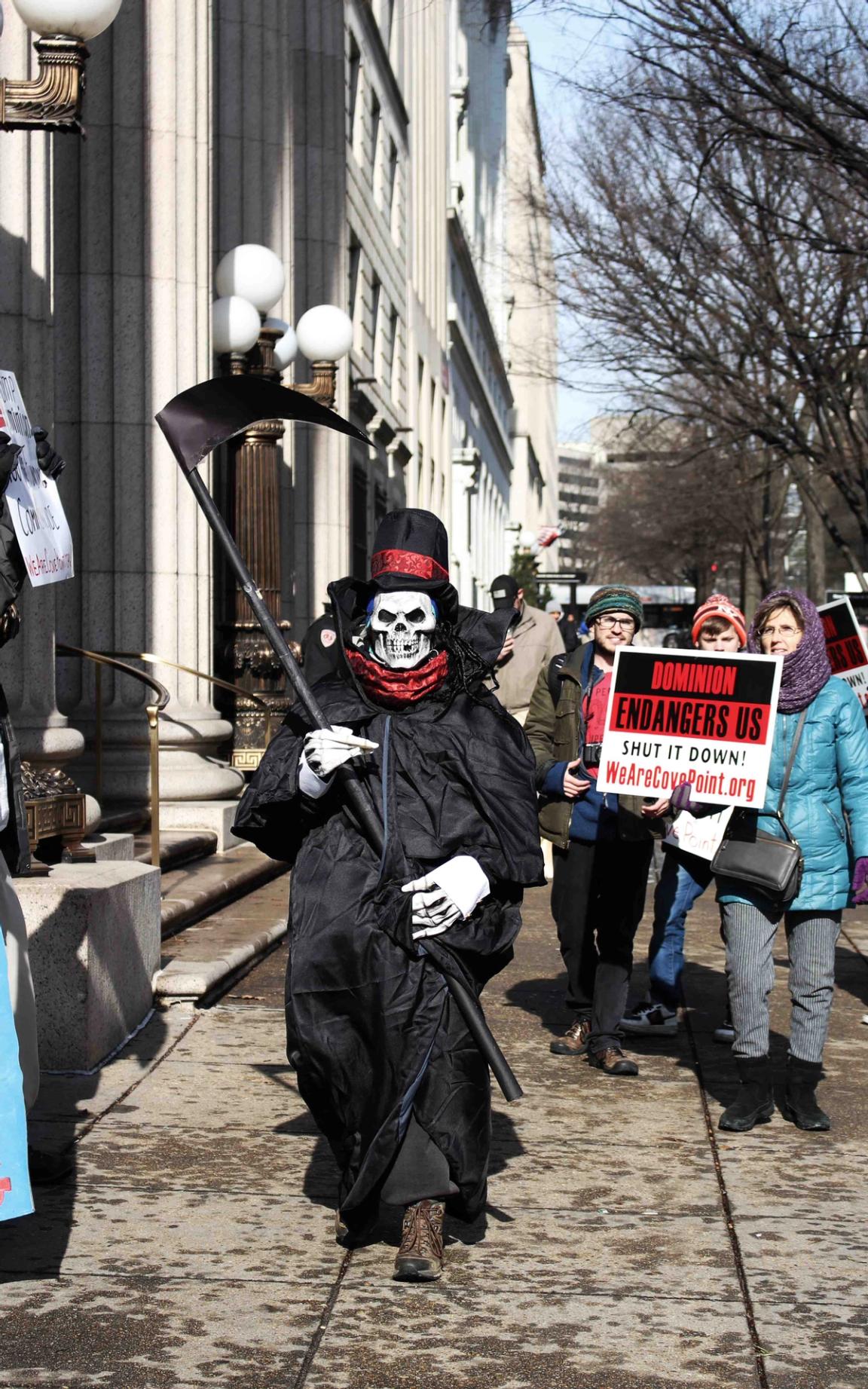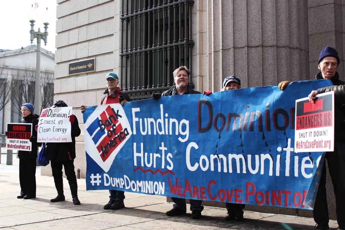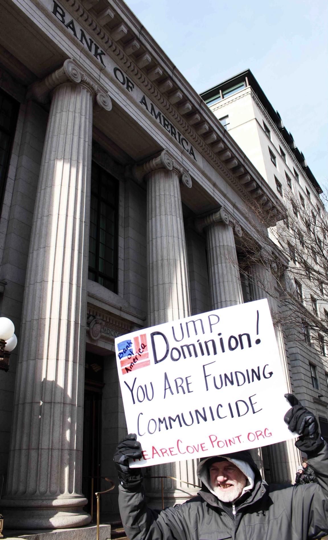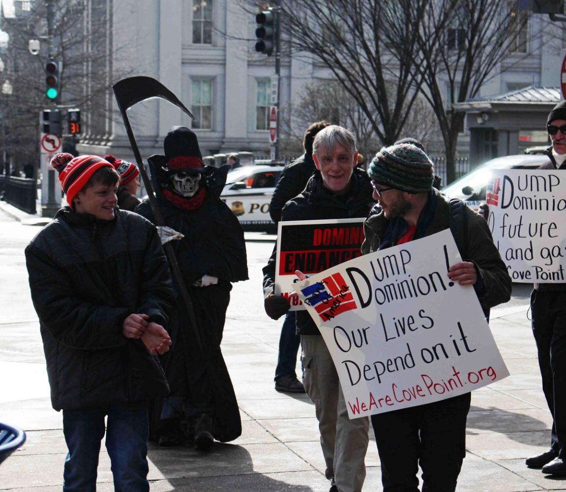 After this morning’s action, activists headed to the Bank of America located across the street from the US Treasury and diagonally across from the White House, strategically situated so as to allow a line of sight to their investment. Blatant corruption aside, the activists’ goal is simple: starve oil and gas giant Dominion by draining their funds. Bank of America has given them a $4 billion line of credit in order to complete the export terminal at Cove Point. If they lose that, the project is fucked. Activists attempted to deliver a letter to the BofA manager but he refused and summarily kicked them out of the bank. Once outside again, protestors picketed outside the bank, chanting, carrying signs and handing out informational pamphlets. Even the grim reaper joined in – signifying, as I understood it, the loss of life caused by climate change, which practices such as fracking promotes, and indeed the loss of soul caused by being a piece of shit who gives money to fund planet and people-killing projects.