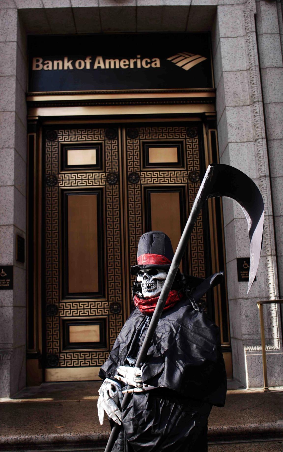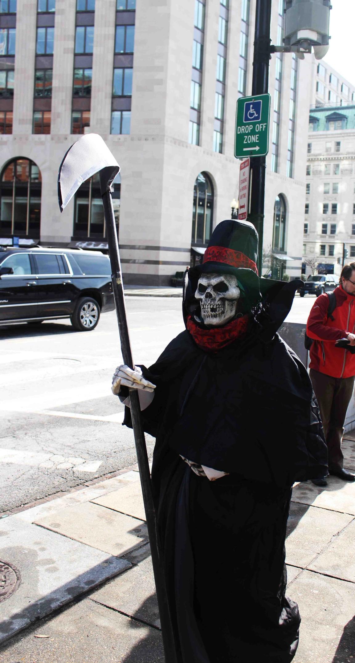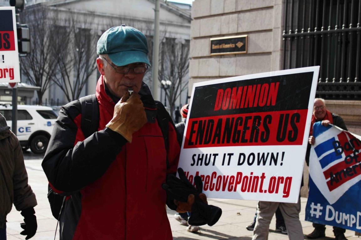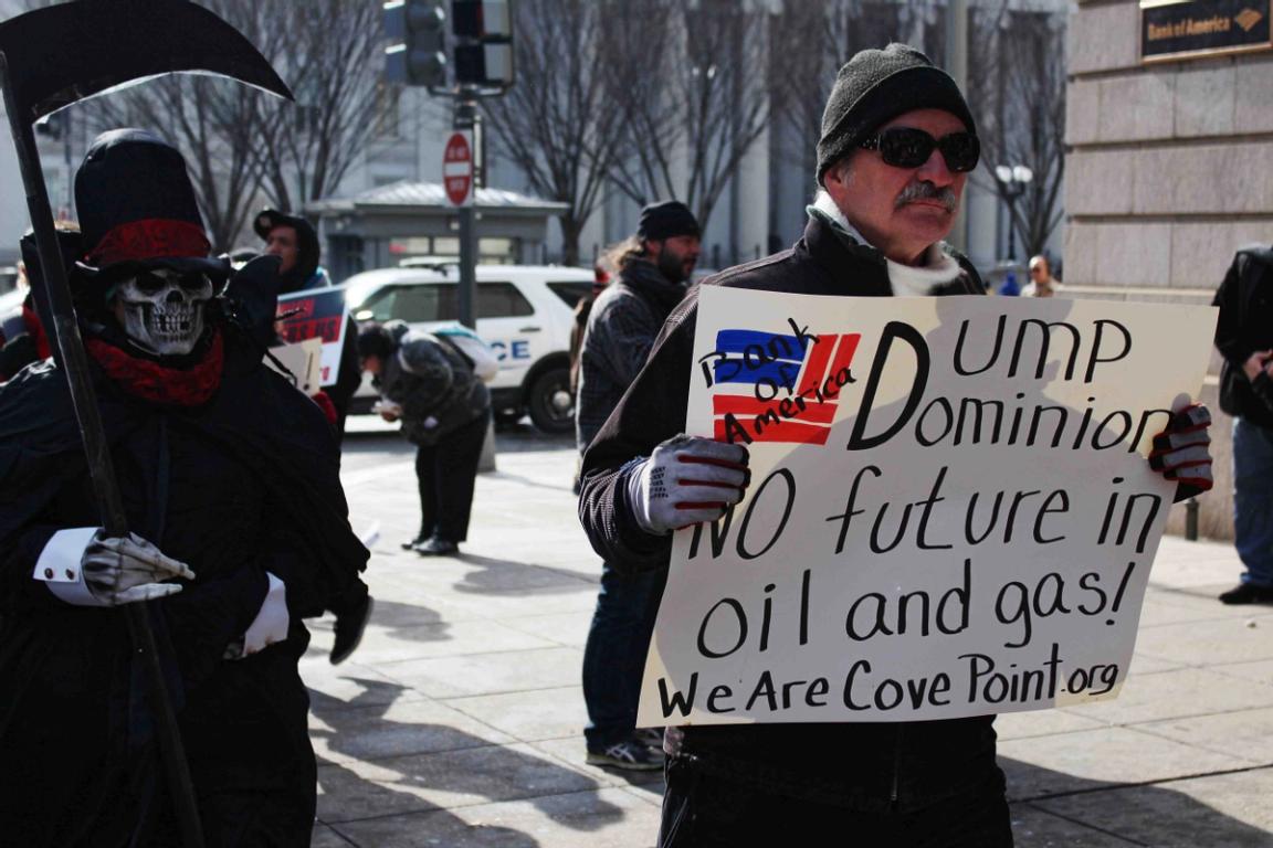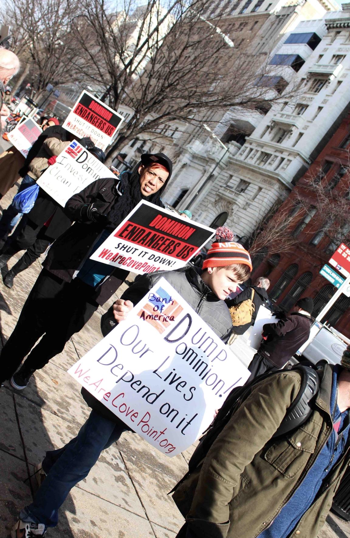 After this morning’s action, activists headed to the Bank of America located across the street from the US Treasury and diagonally across from the White House, strategically situated so as to allow a line of sight to their investment. Blatant corruption aside, the activists’ goal is simple: starve oil and gas giant Dominion by draining their funds. Bank of America has given them a $4 billion line of credit in order to complete the export terminal at Cove Point. If they lose that, the project is fucked. Activists attempted to deliver a letter to the BofA manager but he refused and summarily kicked them out of the bank. Once outside again, protestors picketed outside the bank, chanting, carrying signs and handing out informational pamphlets. Even the grim reaper joined in – signifying, as I understood it, the loss of life caused by climate change, which practices such as fracking promotes, and indeed the loss of soul caused by being a piece of shit who gives money to fund planet and people-killing projects.