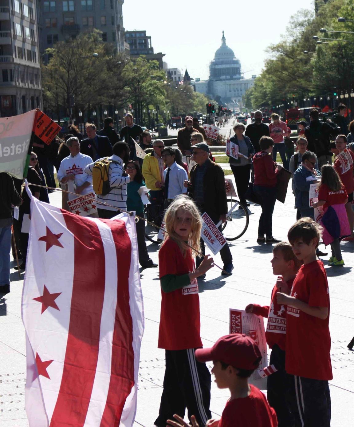 Today, a coalition of groups organized a Rally for Equality, demanding statehood and representation for DC. Backstory: DC is not a state and therefore does not enjoy states rights. What are those? Well, plenty – but most importantly it means that you have representation in the federal government. DC does not. What we have are non-voting delegates, like Eleanor Holmes-Norton. This means that our delegates sit through Congressional proceedings but when it comes time to vote, all they can do is try to persuade other members of Congress to vote in their favor. In other words, members of Congress use DC tax dollars (because yes, we have to pay state taxes) without allowing us a say in how that money is spent. This essentially equates to DC being a colony of the United States – kind of odd and uniquely fucked up for the capital of the country.