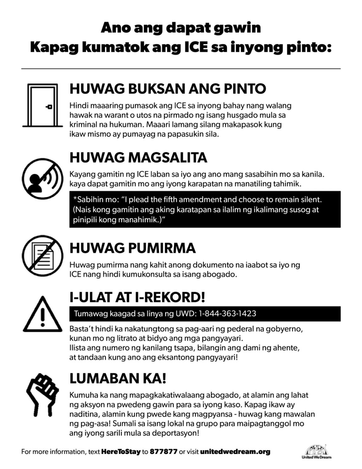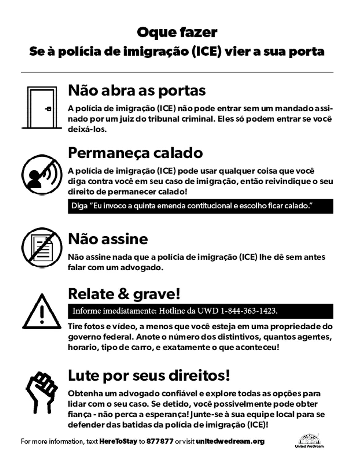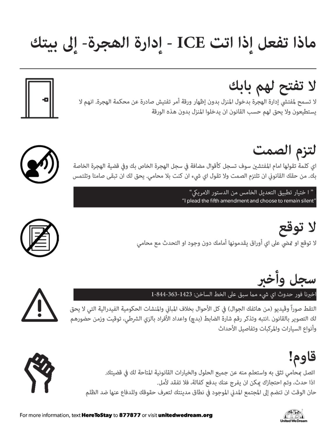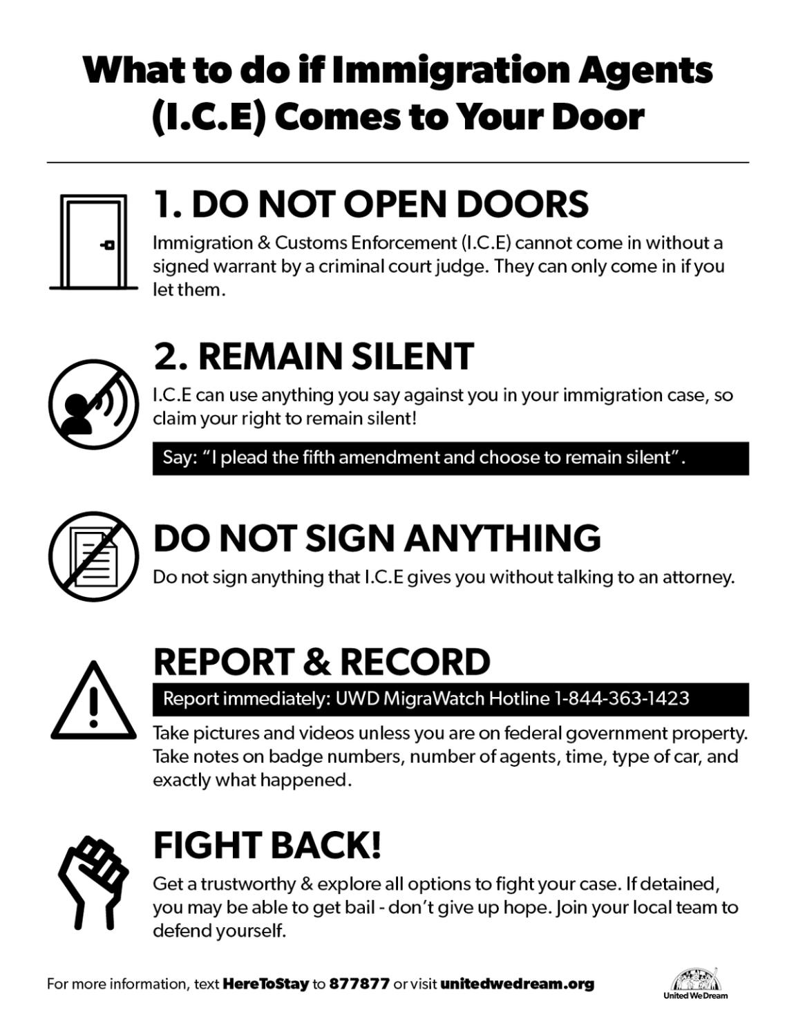 Use resources below to print out a print-friendly version of this page to tape on or near your door. That way, if an immigration officers approaches your home, you will be prepared and know what to do.