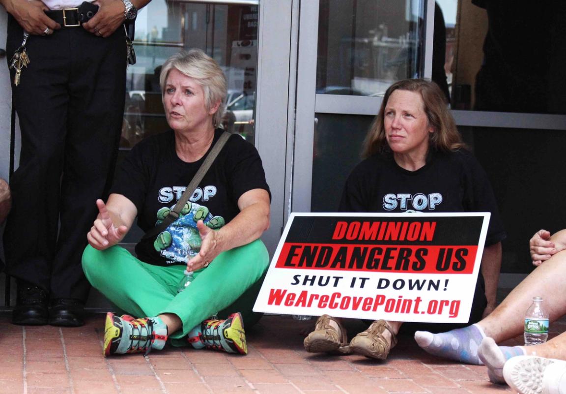 6 people locked themselves together with PVC piping and blocked the entrance to DNC HQ while other protestors held signs and banners.