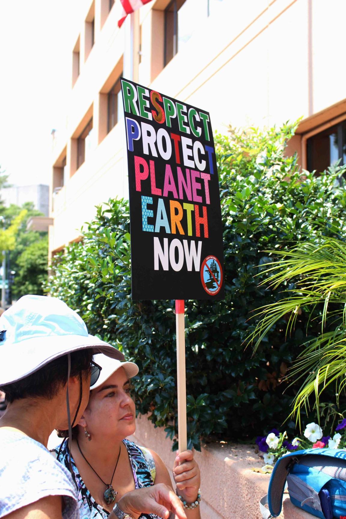 After about an hour of chanting and some powerful speeches by people whose lives have been torn apart already by climate change, the DNC sent down a few people that are nary more powerful than interns to listen to protestors and respond with the usual, “I hear what you’re saying, I appreciate it. Let’s work together.” Which for those of you new to the Democratic party lip service speak, that means “You don’t have nearly enough money for me to care about your problems. Can you please go away, it’s hot out here.”