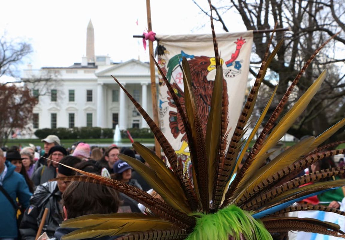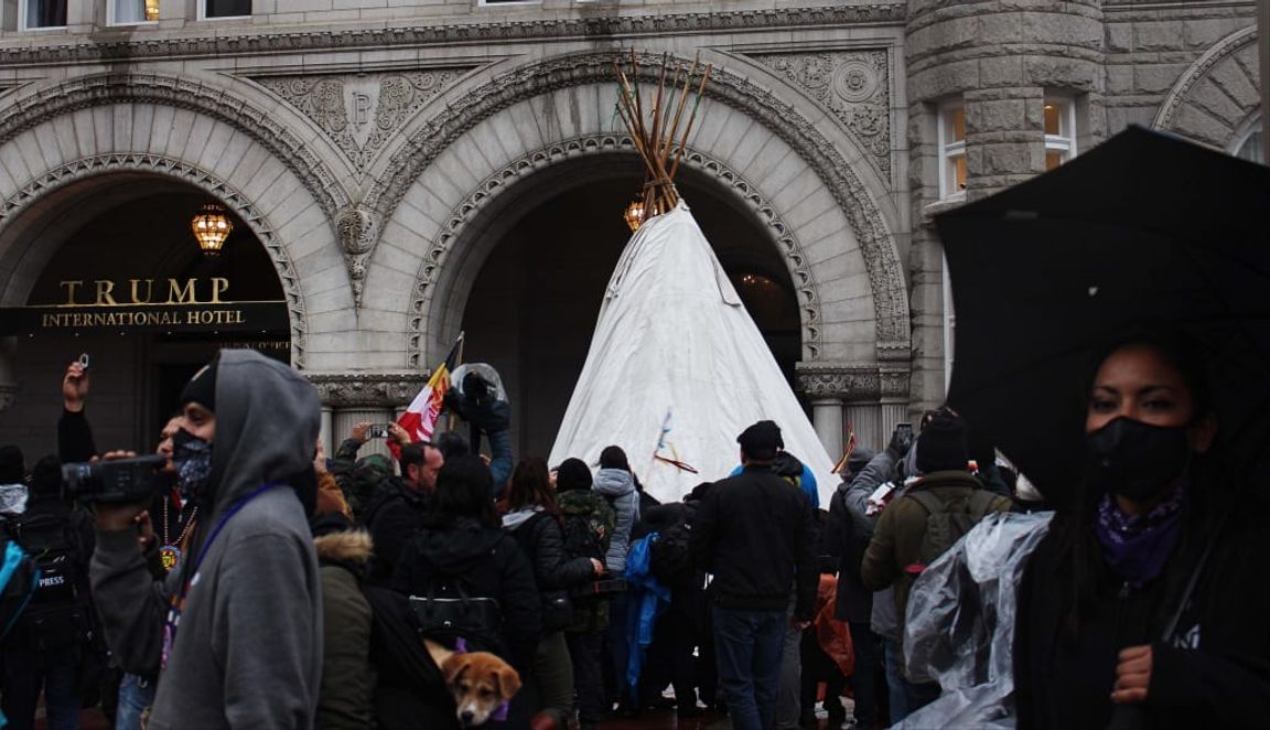 And indeed, they did. Starting at 10am at the Army Corps of Engineers, organizers called out the agency for ignoring the danger to both people and planet that the Dakota Access Pipeline has posed and will pose. As the march made its way through downtown DC, protectors and allies chanted, sang and danced – blending a powerful message of resistance and resolution with an unapologetic celebration of various indigenous cultures, collaboration and friendship. Outside the Trump hotel on Pennsylvania Ave. (the old Post Office building), activists built a tipi and staged a demonstration just outside the front doors before moving onto the White House where ceremonies continued – including planned performances on a stage as well as smaller dance and drum circles.