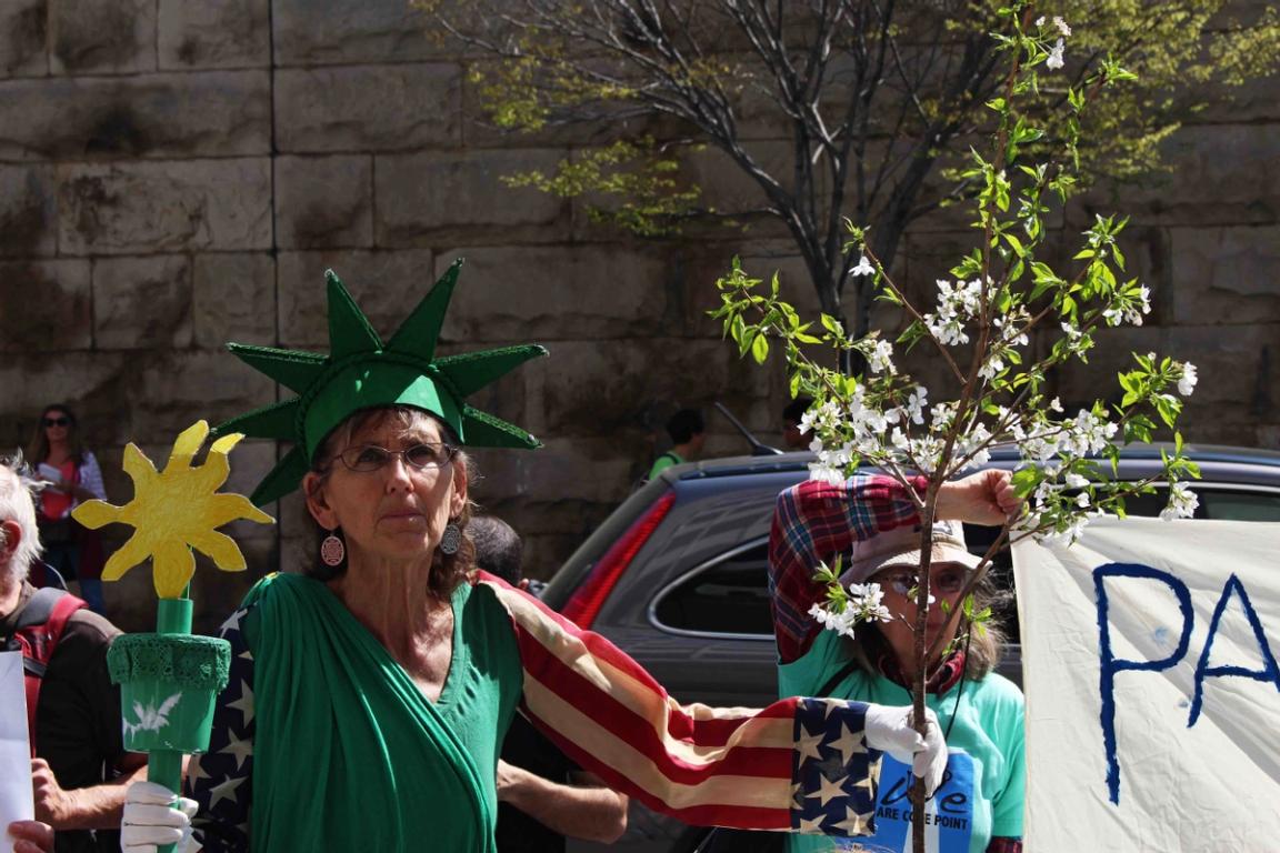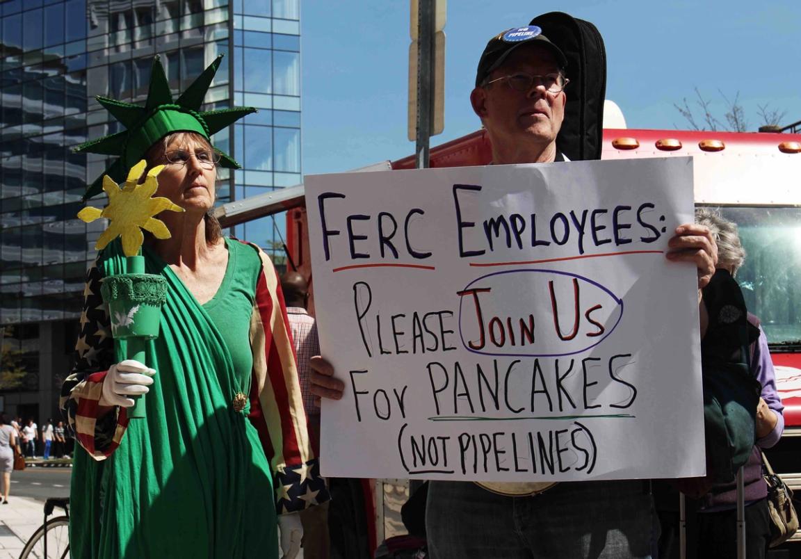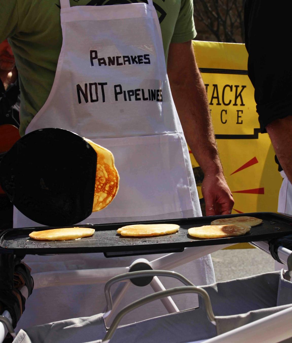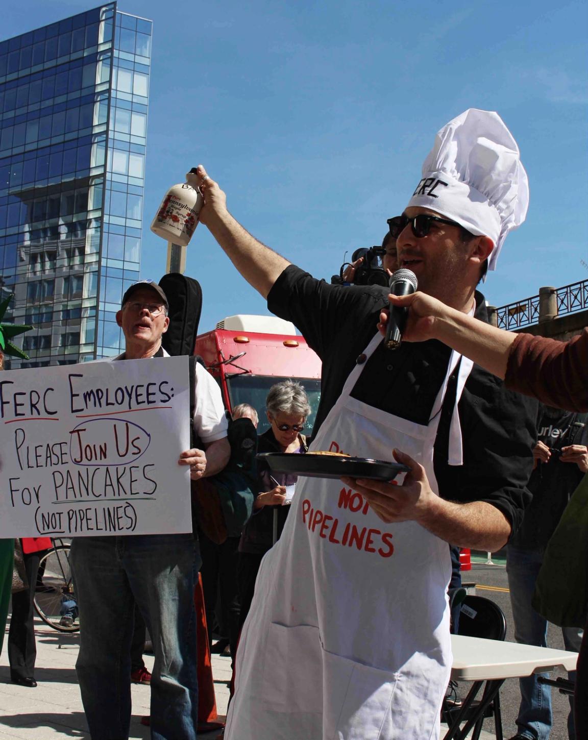 Today at FERC, Beyond Extreme Energy organized a pancake protest. Yep, environmental activist Tim DeChristopher and award-winning documentary film-maker Josh Fox were dressed in aprons, chefs hats and stood behind a solar powered grill cooking up some flapjacks for FERC employees and activists. Why? The Holleran family farm is one of the latest victims of FERC’s frack-happy agenda. A few weeks ago, FERC authorized the decimation of several acres of maple trees on the family’s property and brought in armed federal marshals to ensure that the destruction went through without a hitch. The most disgusting detail: the Constitution Pipeline for which the Holleran land was cleared for has not even been approved yet. So FERC pre-emptively razed a family’s livelihood with no assurance that it was even necessary for their bullshit pipeline.