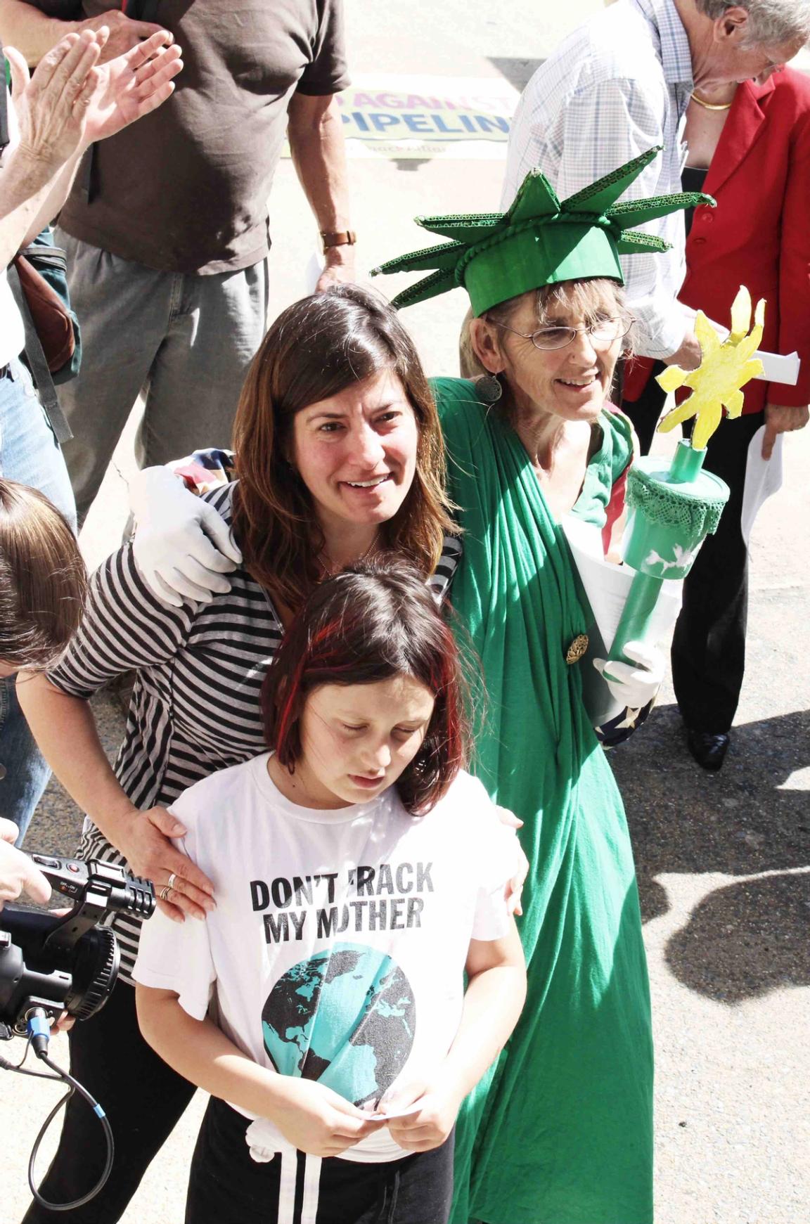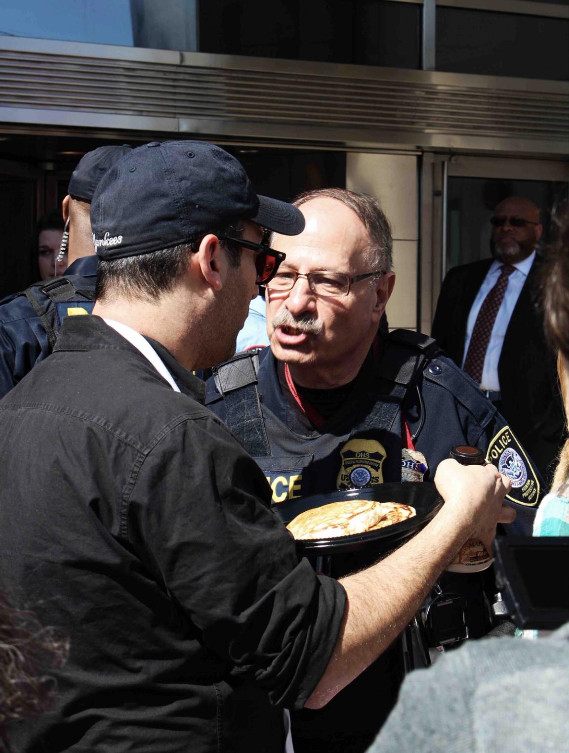 Not content to just sit and wait, Josh Fox tried to walk into the building along with Bethany Yarrow, daughter of Peter Yarrow (of Peter, Paul & Mary), her daughter Valentina and Megan Holleran. However, Homeland Security, along with a half dozen cops and security guards protected the corporate goons from the dangers of solar-powered pancakes.