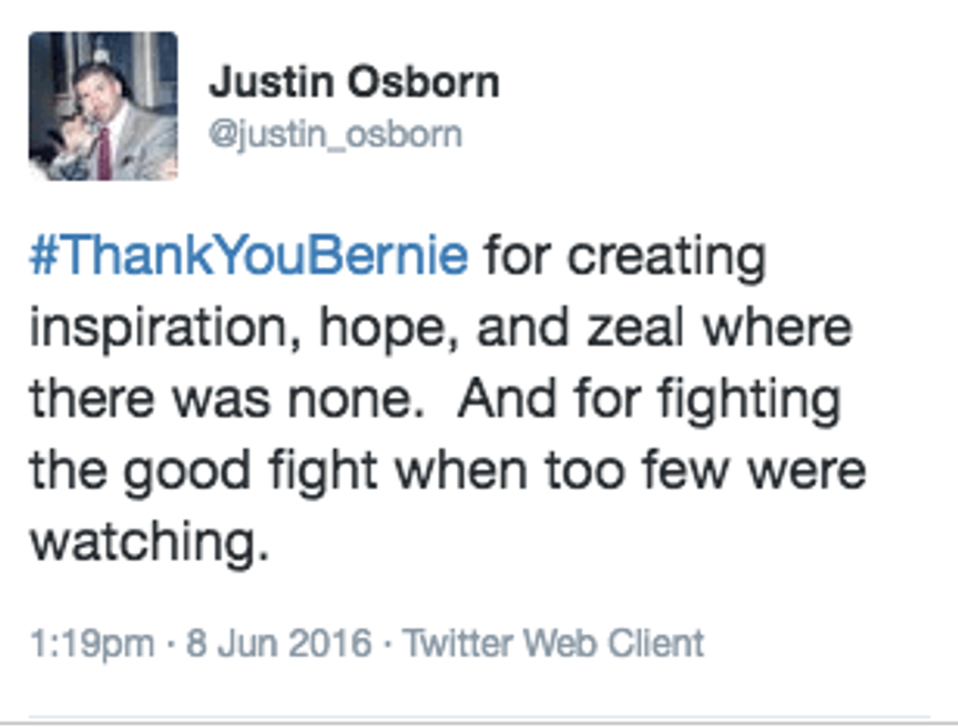 As I scrolled through Twitter last night, I also saw the hashtag #ThankYouBernie lighting up the twittersphere. In short heartfelt memos, his supporters thanked the senator for engaging them in politics, for making them feel that they mattered, for making them feel that all of this corruption, this ingrained systemic evil, could change.